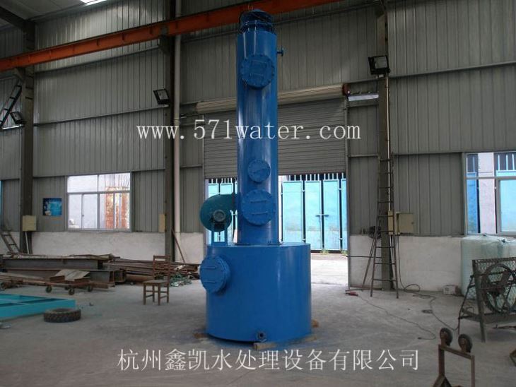 除碳器又叫脫氣塔,他是通過風機的風力來吹脫水中除去游離CO2的設備,一方面減小對鍋爐,過濾器的腐蝕,如果水中含有一定的CO2那么CO2和水產生碳酸,而電離去的氫離子來腐蝕后面的各種容器,另外一個作用,如果用在陰陽離子交換器,可以減輕陰離子交換器的負荷,提高化學除鹽工藝的經濟性和出水水質在一般如果進水HCO3含量》50mg/L時,設置除碳器,其出水CO2含量<5mg/L,除碳器一般設置在陽離子交換器或反滲透裝置之后。脫氣塔另外一個作用可以做為曝氣裝置,主要是于除鐵、錳過濾器前置前,對鐵、錳進行氧化處理,使錳砂過濾器更好的吸附和去掉水中的鐵錳,相對管道曝氣,他具有更大氣流量,所以產生更好的氧化效果,相對鼓風機曝氣,脫氣塔曝氣是采用功率小的離心風機,這種曝氣大大的節省了電能,所以在實際得到更廣泛的引用。